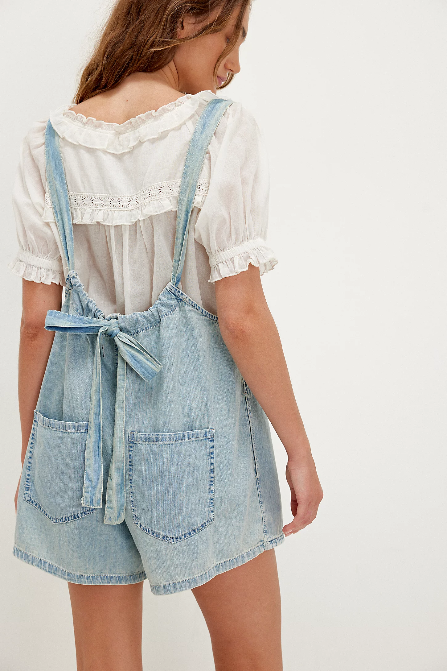 Adjustable Strap Washed Denim Romper with Front Pockets