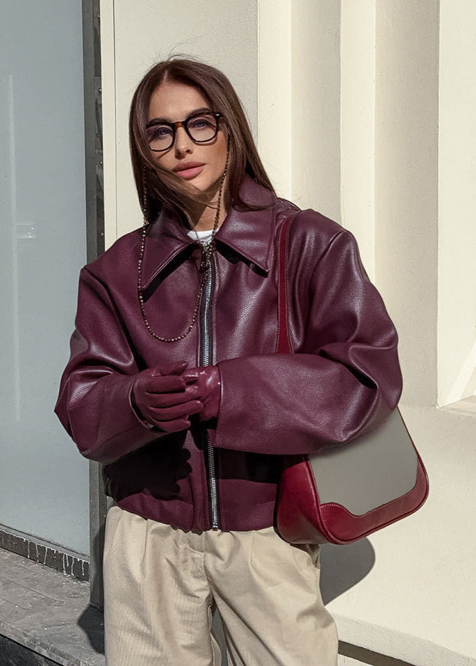 "Fall in love with this chic burgundy faux leather jacket – effortless style, endless compliments!"