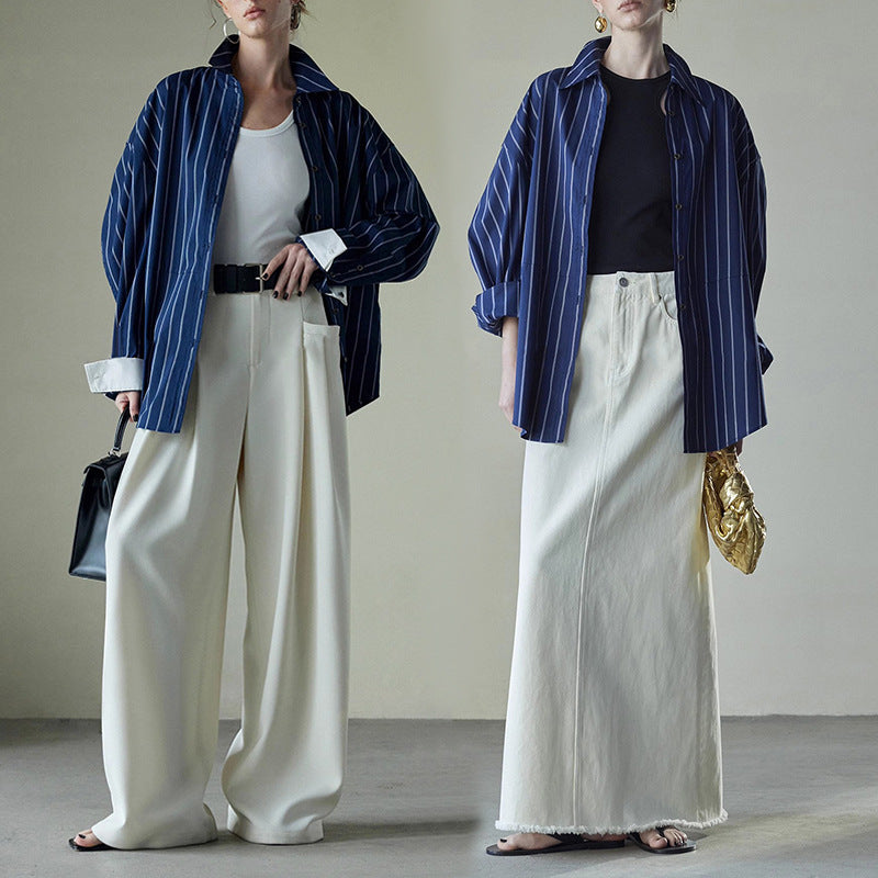 The oversized silhouette of this striped shirt makes it both stylish and practical.