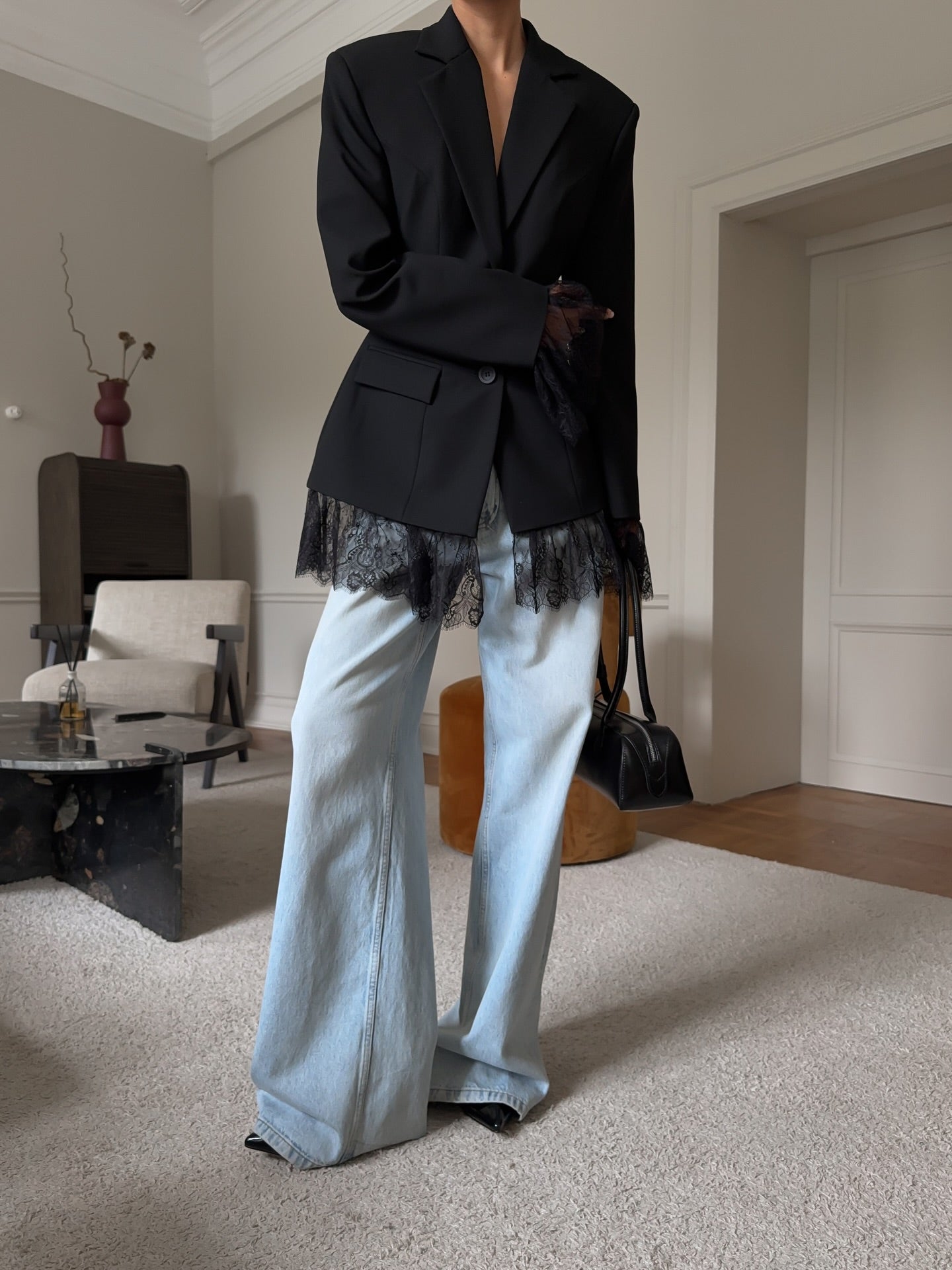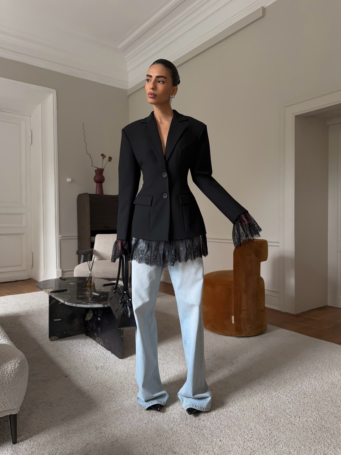 “Boss Babe Vibes 💼✨ Lace-trimmed blazer that’s powerful, chic & unforgettable.Office to dinner date 🌙—this blazer does it all. Effortless chic every moment.”