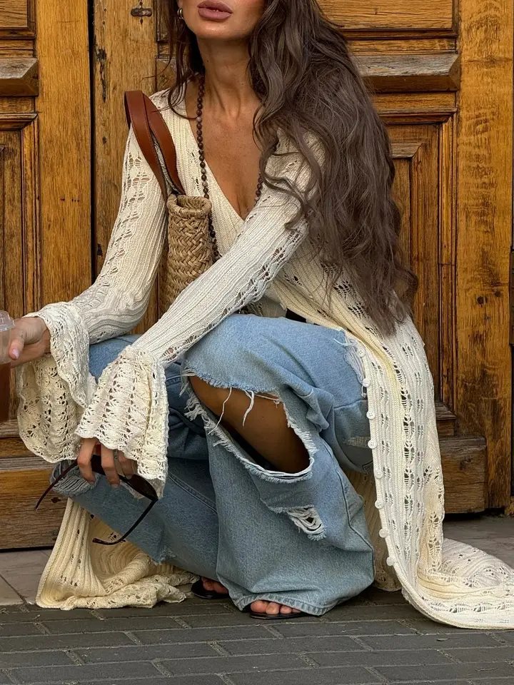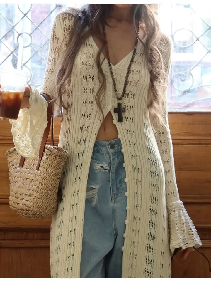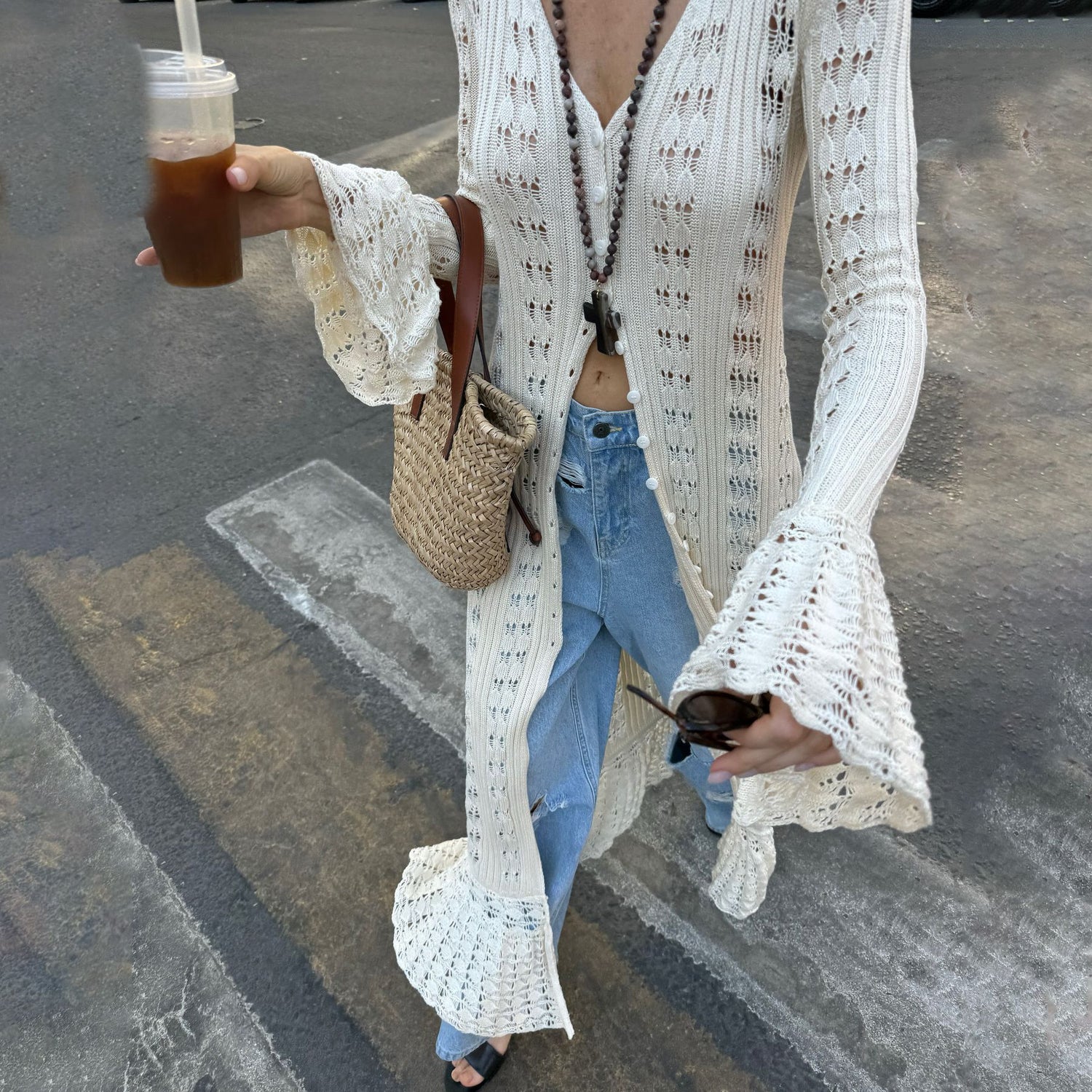Featuring extra-long sleeves with dramatic bell cuffs, this cardigan delivers a statement-making bohemian style. The openwork knit details add depth and a touch of vintage elegance.