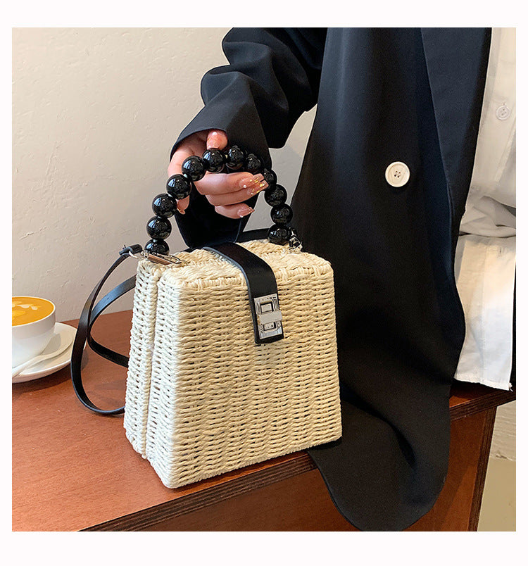 A highlight of the design is the black beaded handle. Not just for function, it acts as a statement detail—adding a luxurious contrast against the natural tone of the woven body. The glossy black beads shimmer subtly, giving off a refined sparkle that elevates even a simple outfit.