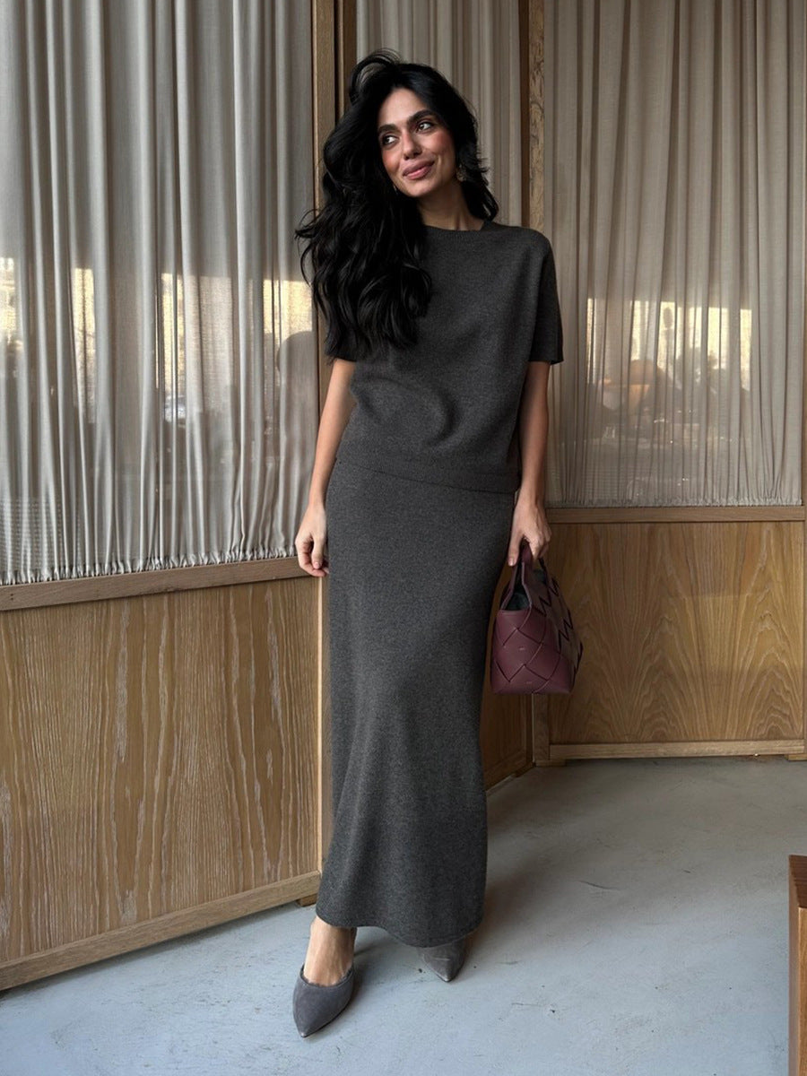 The short-sleeve knitted top paired with a high-waisted long skirt creates a sleek, refined silhouette. With no unnecessary embellishments, the set emphasizes minimalist beauty through clean lines and sophisticated proportions. This design approach makes it a timeless piece, ideal for women who prefer understated luxury and effortless elegance.